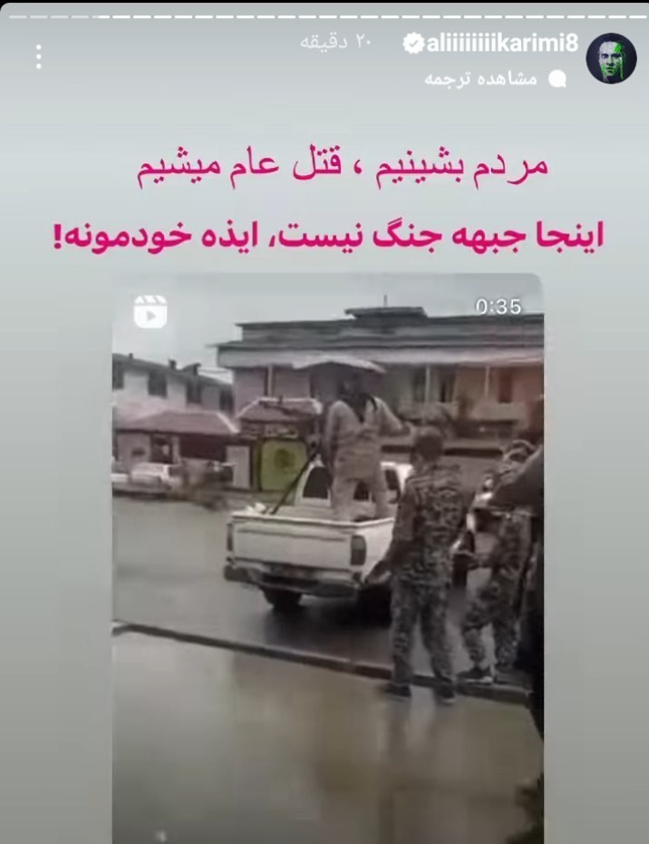 اما علی کریمی در یکی از جدیدترین استوری‌های خود با انتشار تصویری مدعی شده است که در شهر ایذه نیروهای مسلح با دوشکا مردم را به رگبار بسته‌اند و در ادامه گفته: مردم، بشینیم، قتل عام می‌شیم.