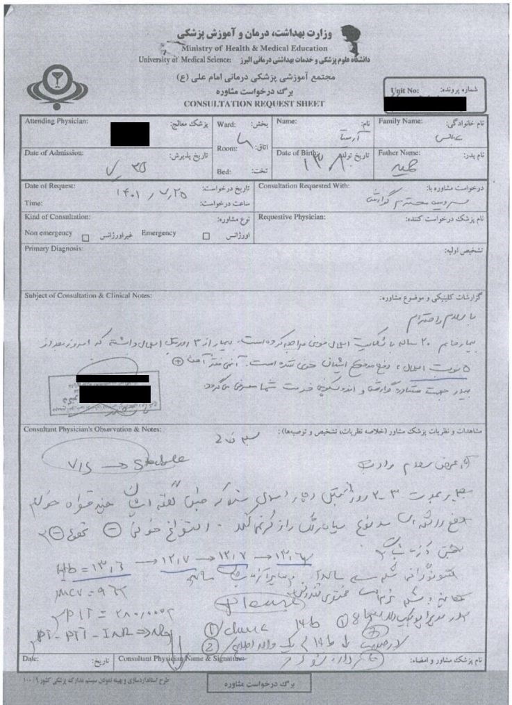 بیمار در هنگام بستری در بیمارستان امام علی(ع) در مورد سوابق بیماری خود قبل از بازداشت به سابقه هموروئید اشاره کرده است.