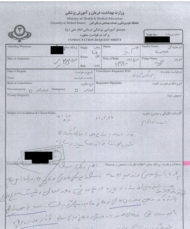 طبق گزارش پرستاری بیمار به اتفاق همراهان پس از عدم رضایت برای انجام آندوسکوپی تمایل به ماندن در بیمارستان نداشته و با رضایت شخصی و با حال عمومی خوب از بیمارستان ترخیص شده است.