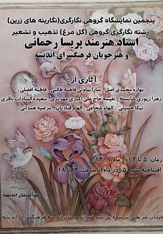 براساس این گزارش، این نمایشگاه آثار هنری روز شنبه 5 آذرماه از ساعت 14 الی 18 در نگارخانه اندیشه فرهنگسرای اندیشه افتتاح شده و تا پنج‌شنبه 10 آذرماه ادامه دارد. ورود برای عموم علاقه‌مندان بلامانع است. هم‌چنین ورکشاپ گروهی در طول هفته جاری ویژه عموم علاقه‌مندان برگزار می‌شود.