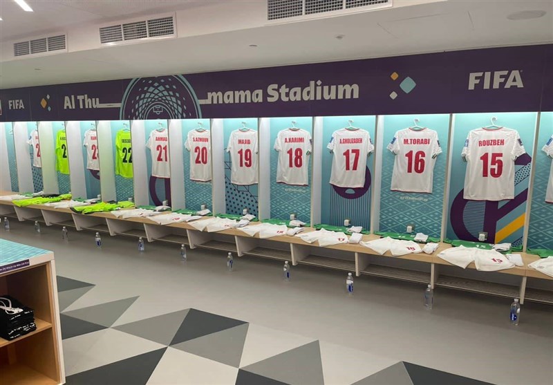 به گزارش خبرگزاری تسنیم، اولین تصاویر از رختکن تیم ملی فوتبال ایران در فاصله دو ساعت به شروع دیدار امشب (سه‌شنبه) مقابل آمریکا منتشر شد که در این تصاویر پیراهن‌های بازیکنان تیم ملی در جایگاه خود نصب شده و همه چیز آماده ورود ملی‌پوشان به ورزشگاه الثمامه دوحه است.