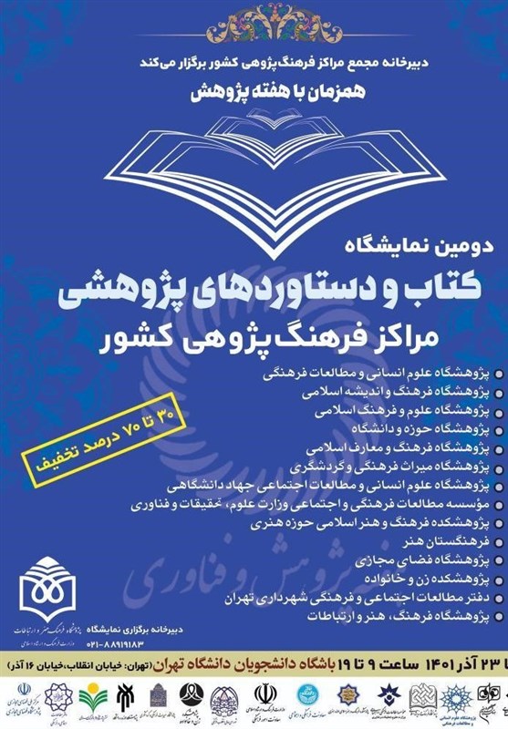 آخرین دستاوردهای پژوهشی پژوهشگاهها و مراکز پژوهشی حوزه فرهنگ و هنر و نیز تازههای کتاب این مراکز از شنبه 19 آذر تا چهارشنبه 23 آذر 1401 در باشگاه دانشجویان دانشگاه تهران با تخفیف 30 تا 70 درصد (ویژه استادان و دانشجویان) به نمایش گذاشته خواهد شد.