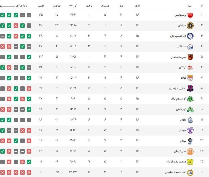 جدول لیگ برتر تا پایان دیدارهای امروز به شرح زیر است: