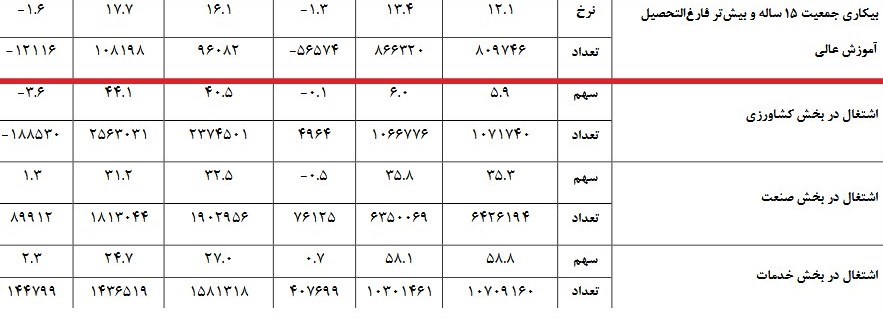 این گزارش‌ها بیانگر این است که بیکاری جمعیت 15ساله و بیش‌تر فارغ‌التحصیلان آموزش عالی در پاییز 1401 حدود 12.1 درصد و تعداد بیکاران 809هزار و 746 نفر و نرخ بیکاری جمعیت 15ساله و بیشتر فارغ‌التحصیلان آموزش عالی در پاییز 1400 حدود 13.4 درصد و حدود 866هزار و 320 نفر است و حدود 1.6 درصد کاهش یافته است.