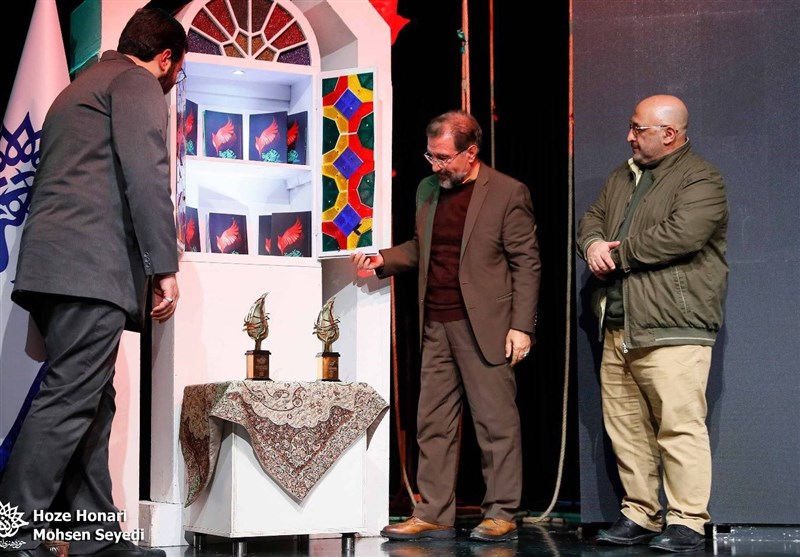 در بخش بعدی آیین اختتامیه چهاردهمین سوگواره هنر عاشورایی با حضور علی فروزانفر (معاون هنری حوزه هنری) و محمدرضا سنگری (مدیر دفتر ادبیات پایداری و نویسنده و پژوهشگر) تقدیرشدگان بخش پرچم و کتیبه معرفی شدند.