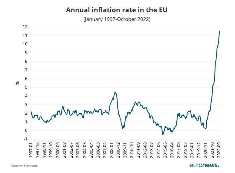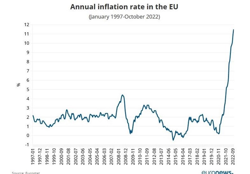 در اتحادیه اروپا، نرخ تورم سالانه در اکتبر (مهر، آبان) 2022 میلادی 11.5 درصد بود در حالی که در ماه مشابه سال قبل فقط 4.4 درصد بود.
