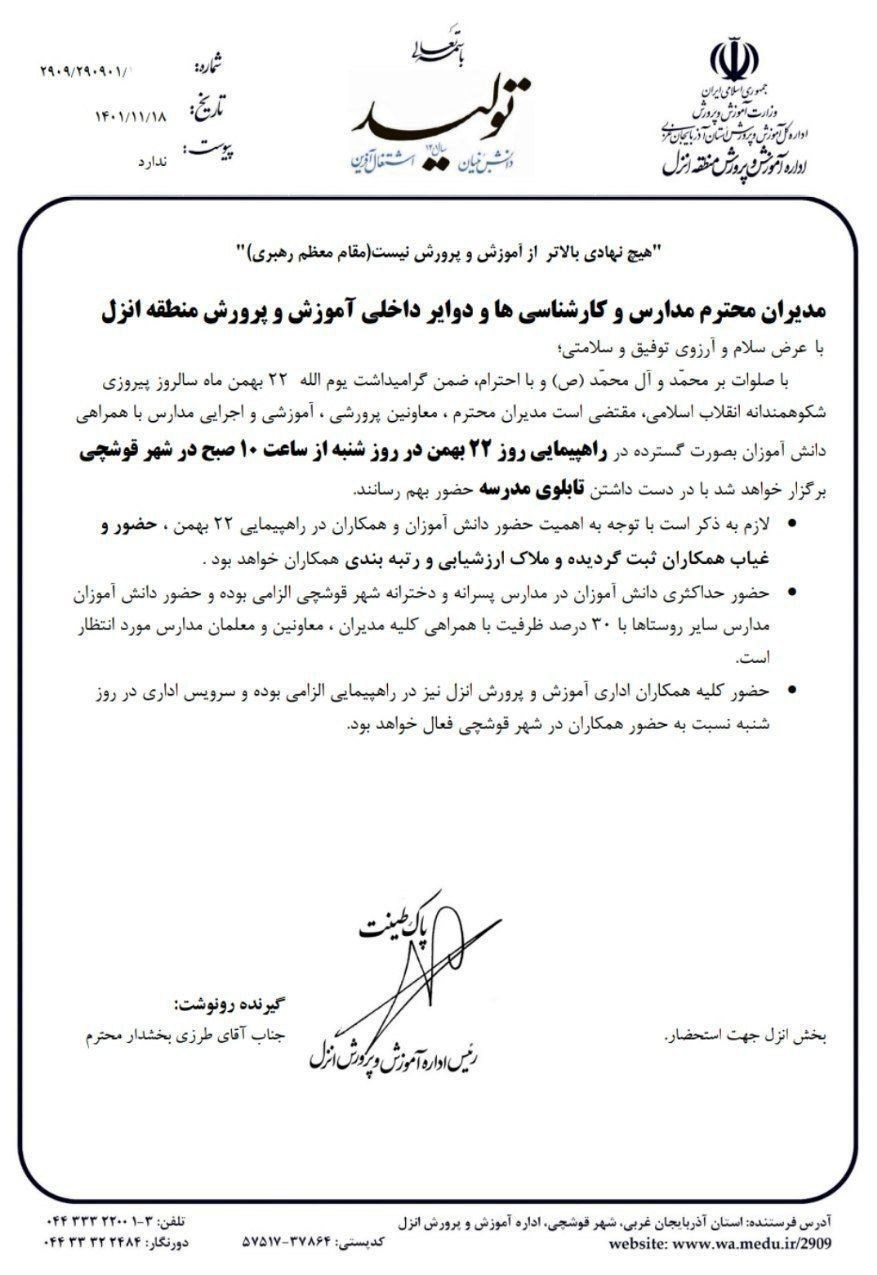 به گزارش خبرنگار اجتماعی خبرگزاری تسنیم، در روزهای اخیر نامهای از سوی یکی از ادارات مناطق آموزش و پرورش استان آذربایجان غربی منتشر شد که بر ضرورت حضور فرهنگیان در راهپیمایی 22بهمن و احتساب امتیاز آن در رتبهبندی و ارزشیابی فرهنگیان تاکید داشت.