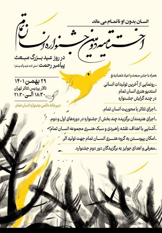 اختتامیه دومین دوره جشنواره انسان تمام در روز عید بزرگ مبعث پیامبر رحمت (ص) همراه با جشن مبعث و اعیاد شعبانیه، رونمایی از آخرین تولیداتِ انسانی استودیو هنری انسان تمام در چند گرایش جشنواره، اجرای تئاتر با محوریت انسان تمام، اجرای هنرمندان برگزیده چند بخش از جشنواره در دورههای اول و دوم و معرفی و اهدای جوایز به برگزیدگان دومین دوره جشنواره برگزار میشود.