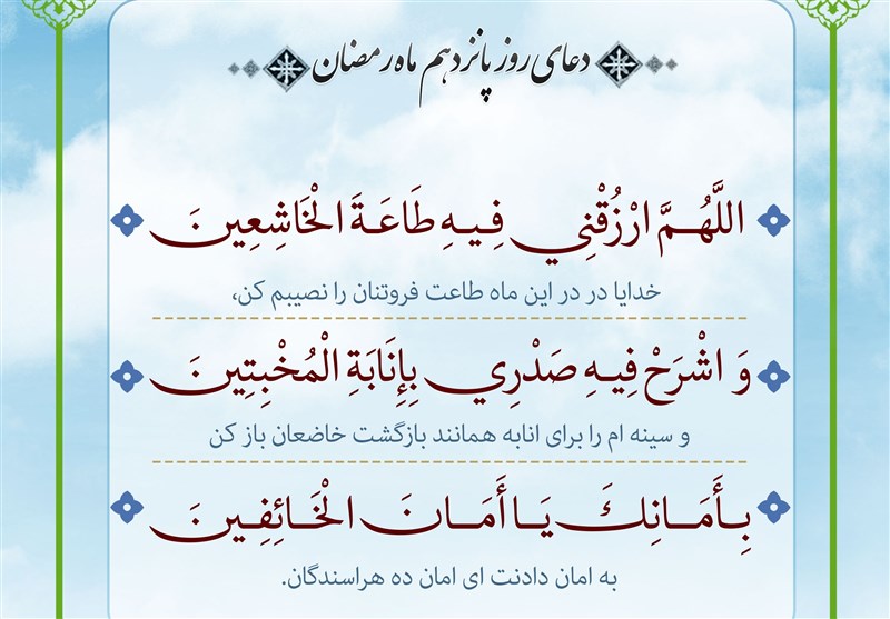 اللهمّ ارْزُقْنی فیهِ طاعَةَ الخاشِعین واشْرَحْ فیهِ صَدْری بإنابَةِ المُخْبتینَ بأمانِکَ یا أمانَ الخائِفین.