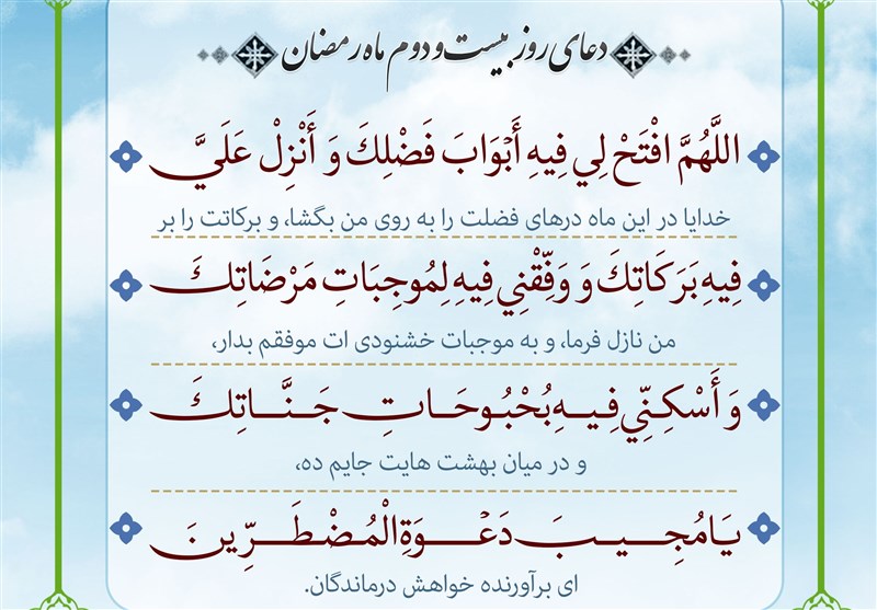 به گزارش خبرنگار فرهنگی خبرگزاری تسنیم، پیامبر(ص) برای هر روز از ماه رمضان دعایی ذکر فرموده‌اند و دعای روز بیست و دوم این ماه مبارک به شرح زیر است: