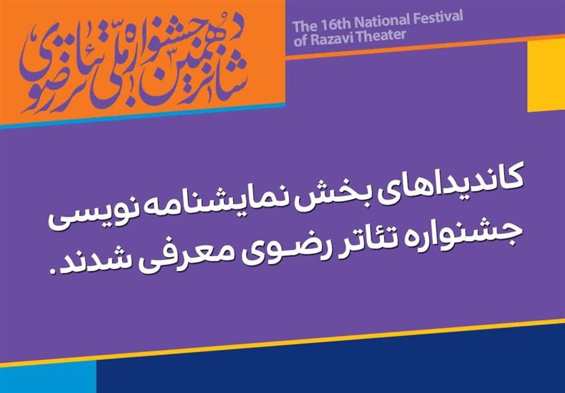 به گزارش خبرگزاری تسنیم به نقل از روابط عمومی جشنواره ملی تئاتر رضوی، از بین 72 نمایشنامه ارسالی به دبیرخانه جشنواره تئاتر رضوی، 12 اثر توسط داوران بخش نمایشنامه نویسی متشکل از نصراله قادری، شهرام کرمی و لیلی عاج به عنوان کاندیدای بخش نمایشنامه نویسی شانزدهمین جشنواره ملی تئاتر رضوی معرفی شدند.