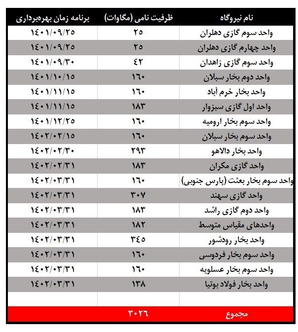 یکی از بخشهای مهم برنامههای تولید و تأمین برق کشور، بهمدار بهرهبرداری وارد شدن نیروگاههای جدید است؛ که در این بخش، برنامهریزی شده 3026 مگاوات ظرفیت جدید نیروگاهی تا پیش از شروع تابستان 1402 وارد مدار بهرهبرداری شود.
