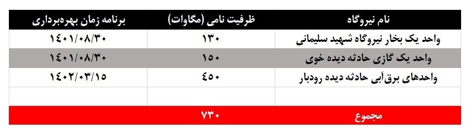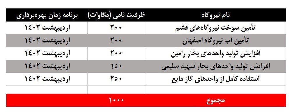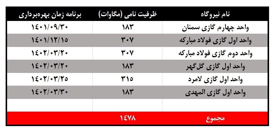 علاوه بر افزایش 3026 مگاواتی ظرفیت تولید برق در 18 واحد مذکور، افزایش 1478 مگاواتی ظرفیت تولید برق با بهمدار آمدن واحدهای جدید در بخش نیروگاههای اختصاصی صنایع در برنامه قرار دارد.