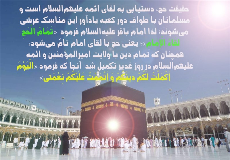 در عرش، انوار شیعیان عترت حول انوار مقدس ایشان گشتند و این عمل را میلیونها سال ادامه دادند.3 با علم و معرفت به این نکته که اهل بیت علیهمالسلام از جانب خداوند صاحبان عرشند و از آنجا امور را تدبیر میکنند، لذا «مدبرات امر» شناخته میشوند و با علم به اینکه طبق روایاتمان، پاکطینتان حول انوار مقدس ایشان در عرش طواف میکردند و با توجه به نمادین بودن کعبه نسبت به عرش خدا، در مییابیم حقیقت حج، دستیابی به لقای ائمه علیهمالسلام است و مسلمانان با طواف دور کعبه یادآور این مناسک عرشی میافتند؛ لذا امام باقر علیهالسلام فرمود «تَمَامُ الْحَجِ لِقَاءُ الْإِمَامِ»؛ یعنی حج با لقای امام تامّ میشود، همچنان که تمام دین با ولایت امیرالمؤمنین و ائمه علیهمالسلام در روز غدیر تکمیل شد، آنجا که فرمود «الْیَوْمَ أَکْمَلْتُ لَکُمْ دینَکُمْ وَ أَتْمَمْتُ عَلَیْکُمْ نِعْمَتی»؛ یعنی امروز دینتان را تکمیل کردم و نعمتم را تام قرار دادم.