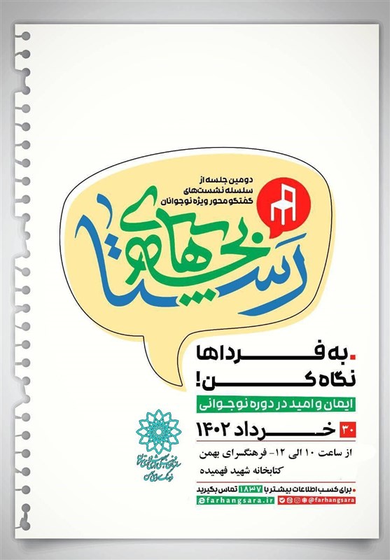 به گزارش خبرگزاری تسنیم، سلسله نشستهای گفت وگو محور نوجوانان با عنوان «بچههای رستا» با مشارکت اتحادیه انجمنهای اسلامی شهر تهران(منطقه 16)، با هدف ترویج روحیه پرسشگری نوجوانان در قالب هم اندیشی و پرسشگری با موضوع انقلاب اسلامی و اندیشههای امام خمینی(ره) از ساعت 10 تا 12 سه شنبه 30 خرداد ماه در سالن کتابخانه شهید فهمیده فرهنگسرای بهمن برگزار خواهد شد.