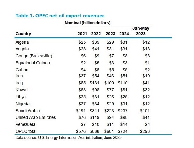 بهدلیل افت قیمت نفت همه اعضای اوپک در سال 2023 با افت درآمد نفتی مواجه شدهاند و بر همین اساس اداره اطلاعات انرژی آمریکا پیشبینی کرده است درآمد نفتی اوپک در این سال به 681 میلیارد دلار و درآمد نفتی ایران به 46 میلیارد دلار کاهش یابد.