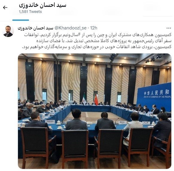 سید احسان خاندوزی در صفحه شخصی خود در فضای مجازی نوشت: کمیسیون همکاریهای مشترک ایران و چین را پس از 4 سال و نیم برگزار کردیم. توافقات سفر آقای رئیسجمهور به پروژههای کاملا مشخص تبدیل شد. با فضای سازنده کمیسیون، به زودی شاهد اتفاقات خوبی در حوزههای تجاری و سرمایهگذاری خواهیم بود.