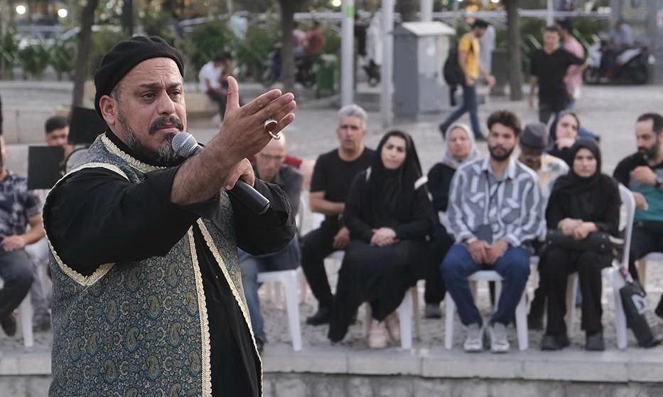 در محوطه باز مقابل تئاتر شهر، نوای عاشوراییان اوج گرفته و جماعت مشتاق، بیتفاوت به شلوغی شامگاهی شهر، محو هنرنمایی هنرمندان نوازنده دمام و سنج هستند.