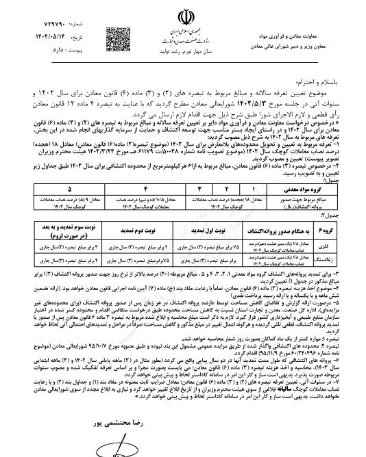 علاوه بر این مصوبه شورای عالی معادن موضوع تعیین تعرفه سالانه و مبالغ مربوط به تبصره های 2 و 3 ماده 6 قانون معادن برای سال 1402 و سنوات آتی نیز توسط دبیر شورای عالی معادن ابلاغ شد.