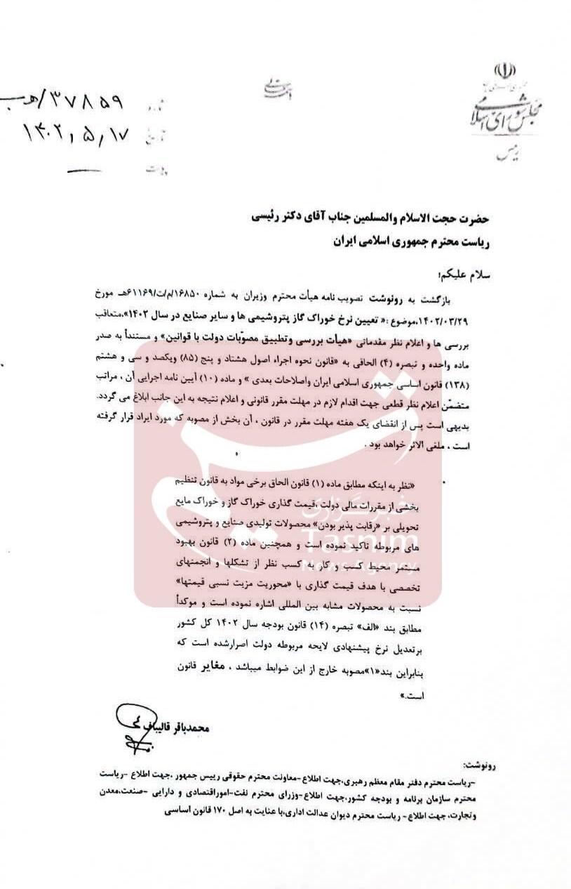 رئیس مجلس شورای اسلامی درباره لغو مصوبه افزایش نرخ خوراک گاز پتروشیمی‌ها در هیئت تطبیق مصوبات دولت به رئیس‌جمهور نامه نوشت و خوستار اعلام نظر قطعی ظرف یک هفته شد.