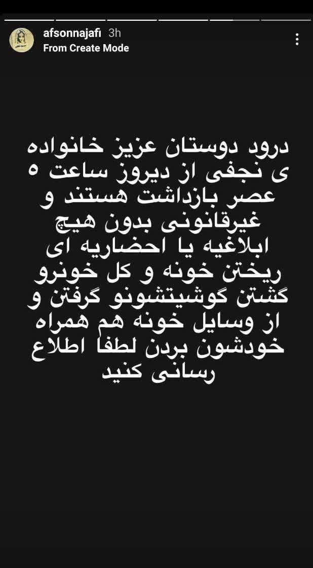 به گزارش خبرگزاری تسنیم از کرج، روز گذشته افسون نجفی خواهر حدیث نجفی در صفحه اینستاگرامی خود مدعی شد مأموران امنیتی با حضور در منزل پدریاش، اقدام به بازداشت اعضای خانواده و ضبط برخی از وسایل از جمله تلفن همراه کردهاند.