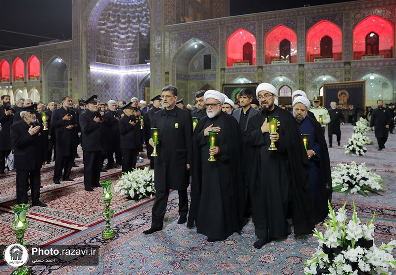 خادمان امام رضا(ع) پس از اقامه نماز، با شمعدانهای لاله به سمت حرم مطهر حرکت کردند و با نوای ذاکران اهل بیت(ع) همنوا شدند.