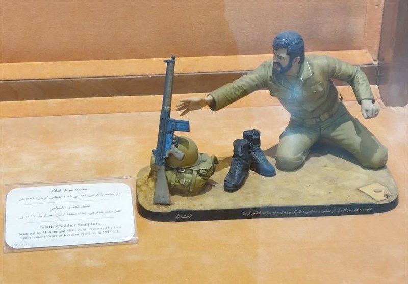 در بین مجموعه آثاری که پشت ویترینهای شیشهای موزه هدایای مقام معظم رهبری حرم مطهر رضوی قرار گرفته است، دو اثر نفیس هنری به چشم میخورد که تداعیکننده دوران دفاع مقدس در نظر بازدیدکنندگان موزه است. مجسمه «سرباز اسلام»، یکی از این دو اثر موزهای است که با تکنیک ریختگی و قالبگیری از جنس رزین به طول 5/32، عرض 5/22 و ارتفاع 5/18سانتیمتر توسط هنرمند معاصر محمد شاهرخی ساخته شده و از طرف ناحیه انتظامی کرمان اهدا شده است.