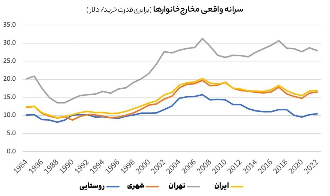 ارقام پایین (و اطلاعات متناظر در جدول یک در پایان این مقاله) هزینه های متوسط واقعی یا مصرف به ازای هر نفر بر اساس برابری قدرت خرید به دلار آمریکا به تناسب منطقه سکونت را نشان می دهد. سهم جمعیت این مناطق با اعداد گرد شده که بتوان آنها را به خاطر سپرد به ترتیب 25 و 60 و 15 درصد هستند. برای بدست آوردن اعداد برابری قدرت خرید به دلار امریکا، رقم ریال را بر عامل تبدیل اعلامی سال 2022 توسط بانک جهانی (62780 ریال به ازای هر دلار) تقسیم کردم. در این مقاله، تمرکز بیشتر بر دو سال گذشته بوده است اما مانعی برای بررسی تمام گزارشها از سال 1984 وجود ندارد (از نتایج سال های دیگر برای اثبات نکته ای که در پایان مقاله می آید استفاده خواهم کرد).