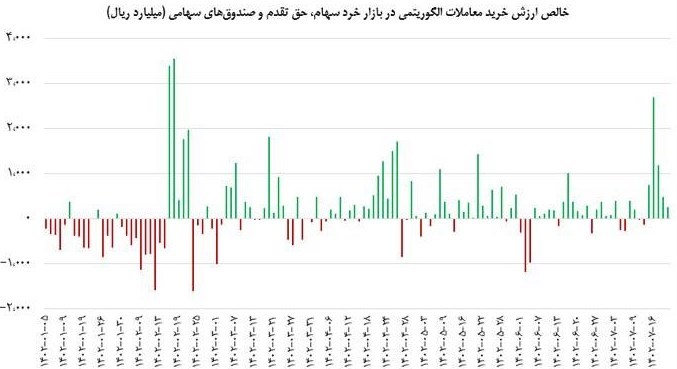 از ابتدای سال1402 تاکنون خالص ارزش خرید معاملات الگوریتمی 22،157 میلیاردریال و در هفته گذشته 5،359 میلیاردریال بوده است.