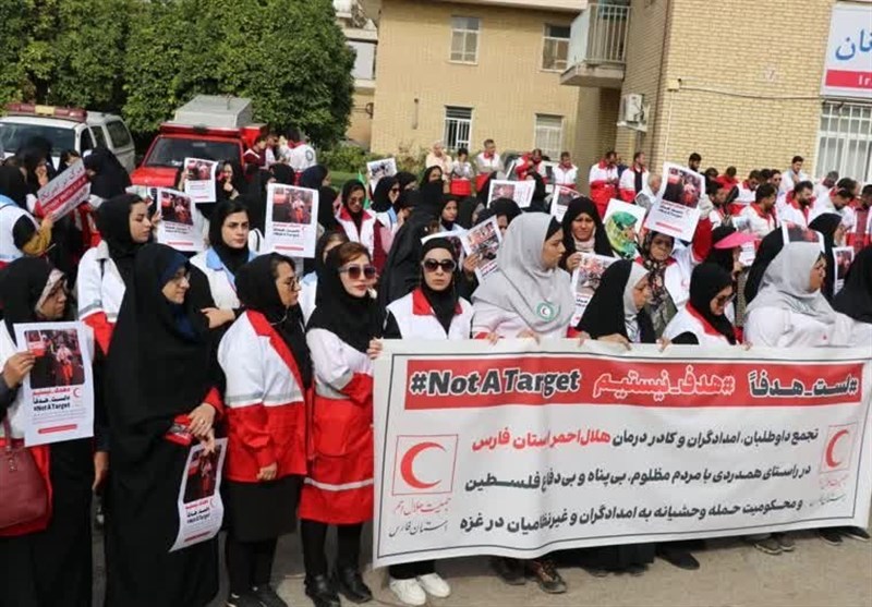 به گزارش خبرگزاری تسنیم از شیراز، تجمع داوطلبان، امدادگران و کادر درمان هلال احمر استان فارس در راستای همدردی با مردم مظلوم، بی پناه و بی دفاع فلسطین و محکومیت حمله وحشیانه به امدادگران و غیر نظامیان در غزه، صبح امروز 29 مهرماه در محل یادمان شهدای امدادگر جمعیت هلال احمر استان فارس برگزار شد.