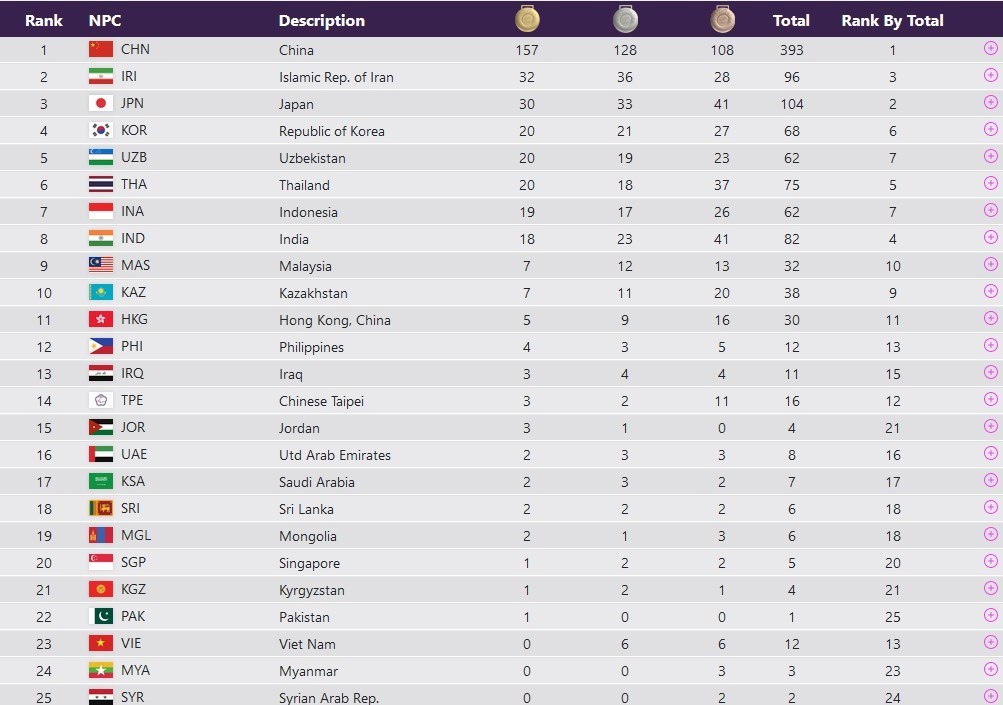 جدول توزیع مدال‌های بازی‌های پاراآسیایی هانگژو در زیر آمده است:
