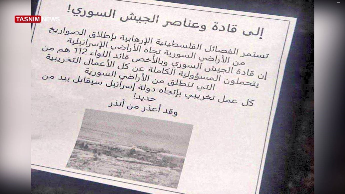 آنها به این امر بسنده نکرده؛ بلکه حتی متوسل به حربة تهدید از طریق ریختن اطلاعیههای هشدارآمیز [از آسمان] بر روی نقاط استقرار یگانهای ارتش سوریه شد. در این اطلاعیهها به نظامیان سوری نسبت به عواقب همکاری با «حزبالله» [و گروههای مقاومت] هشدار میدهند. آن هم درست در برههای که ارتش سوریه به عنوان متحد و پشتیبان حزبالله شناخته میشود و در جبههای که اگر آتش جنگ در آن شعلهور گردد، به خطرناکترین جبهه برای اشغالگران صهیونیست تبدیل خواهد شد.