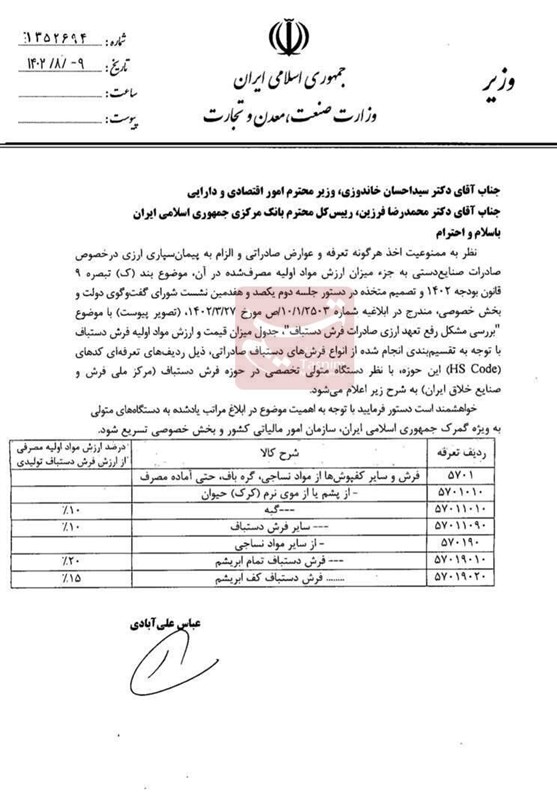 به گزارش خبرگزاری تسنیم، «عباس علی‌آبادی» وزیر صمت در نامه‌ای به خاندوزی وزیر اقتصاد و فرزین رئیس کل بانک مرکزی با اشاره به ممنوعیت اخذ هرگونه تعرفه و عوارض صادراتی و الزام به پیمان‌سپاری در خصوص صادرات صنایع دستی، جدول میزان قیمت و ارزش مواد اولیه فرش دسبتاف را برای انواع فرش‌های دستباف صادراتی ابلاغ کرد.