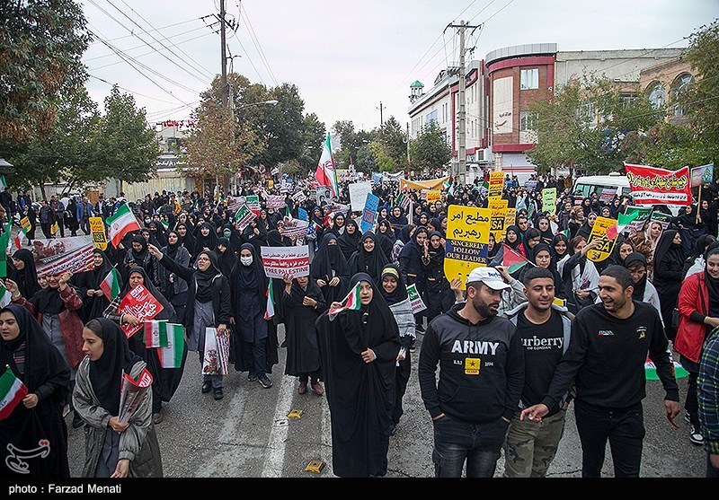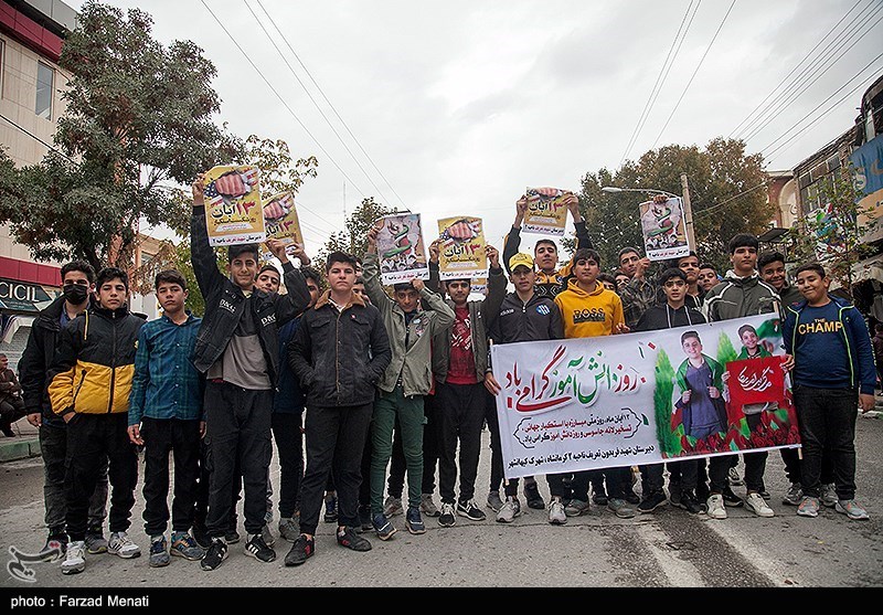مردم ولایتمدار کرمانشاه همچنین پلاکارد نوشته‌هایی که مزین به بیانات حضرت امام (ره) و رهبر معظم انقلاب در خصوص اهمیت روز 13 آبان بود، در دست داشتند.