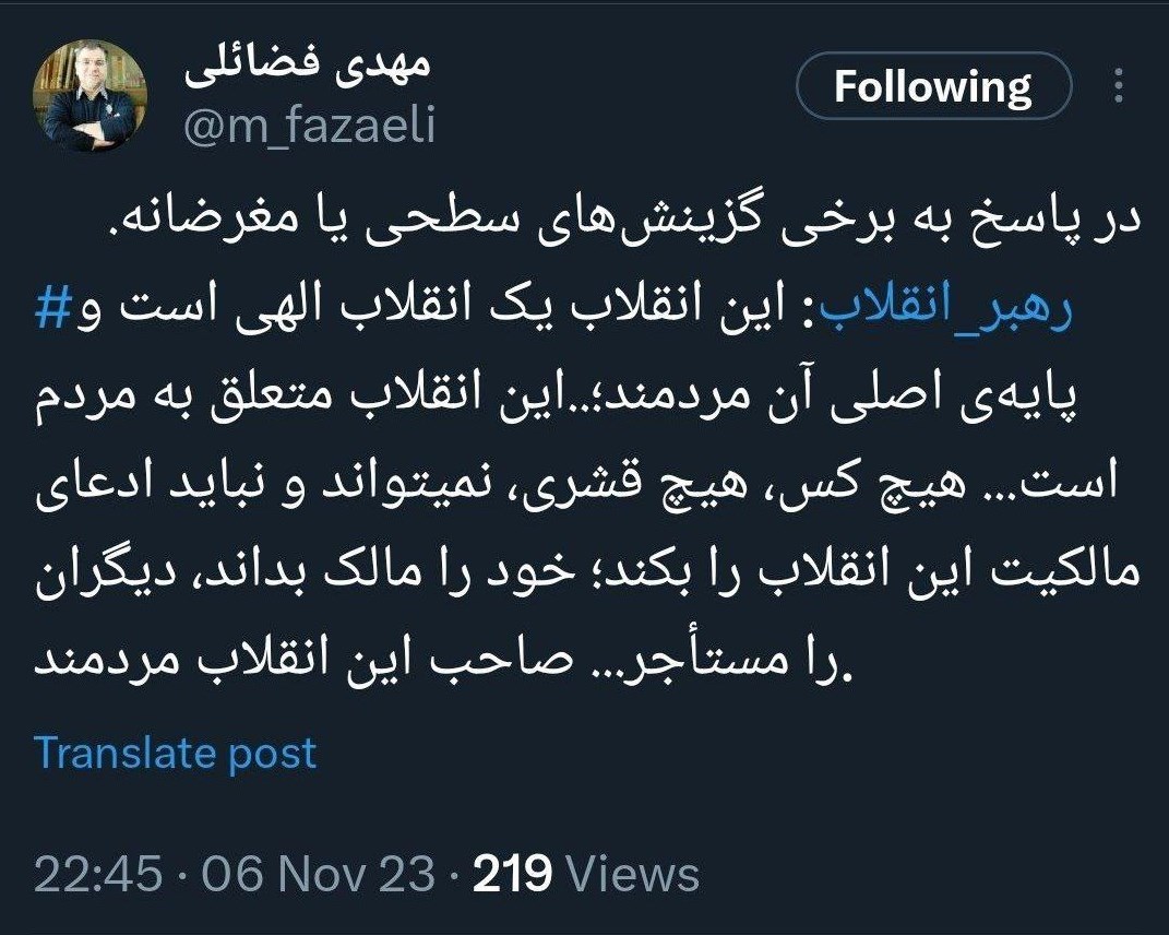 به گزارش خبرگزاری تسنیم، مهدی فضائلی عضو دفتر حفظ و نشر آثار رهبر انقلاب در پاسخ به برخی گزینش‌های سطحی یا مغرضانه جمله‌ای از رهبر انقلاب را در حساب شبکه‌ی اجتماعی ایکس (توئیتر) منتشر کرد؛‎