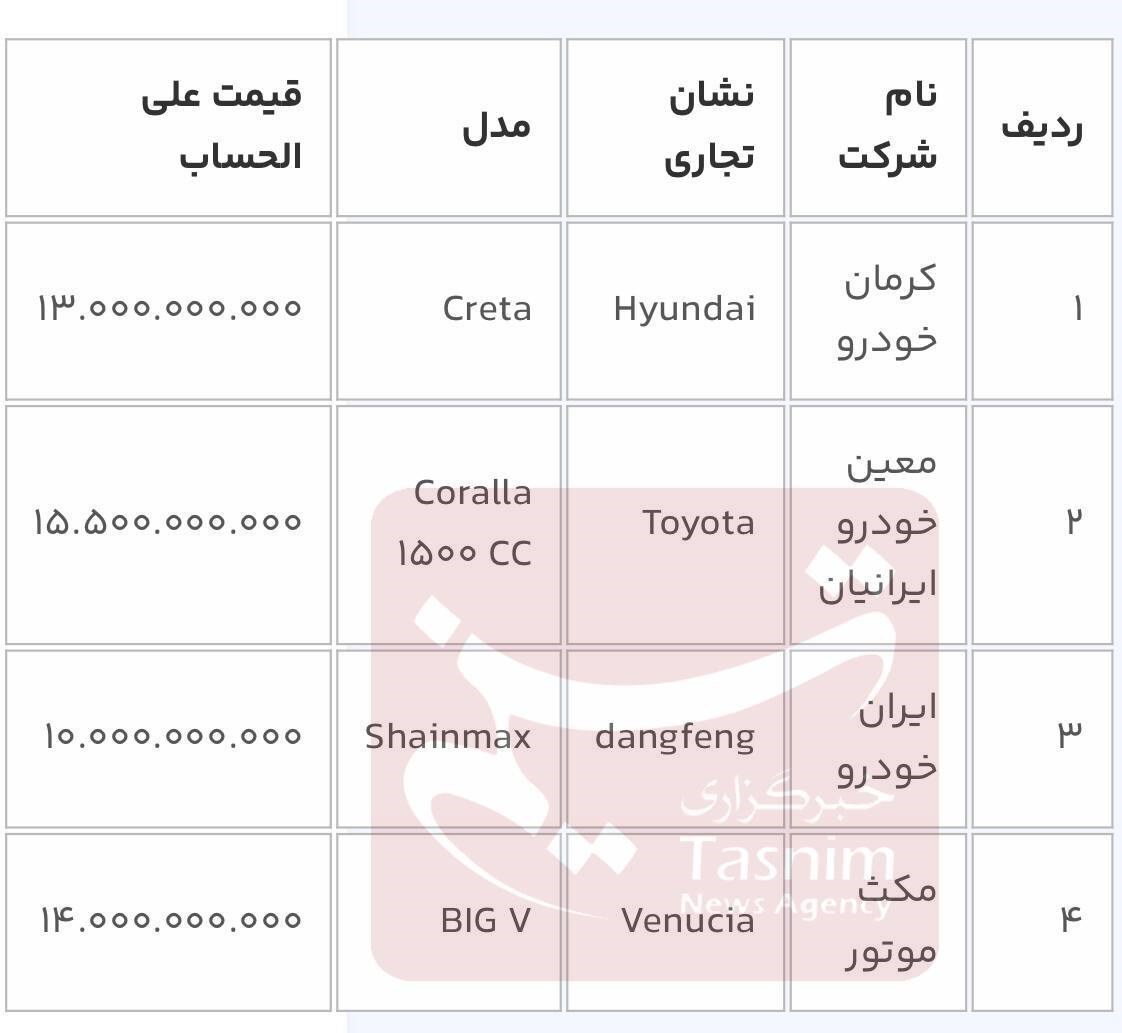 علاوه بر این برآورد قیمت فروش محاسباتی 4 خودرو علی الحساب در مبادی ورودی نیز به شرح زیر اعلام شده است: