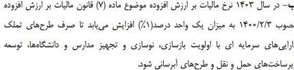 به گزارش خبرنگار اقتصادی خبرگزاری تسنیم، بر اساس بند ب تبصره 7 لایحه بودجه سال 1403 نرخ مالیات بر ارزش افزوده موضوع ماده 7 قانون مالیات بر ارزش افزوده مصوب سال 1400، یک واحد درصد (1%) افزایش یافت، همچنین این منابع صرف طرحهای تملک داراییهای سرمایهای با اولویت بازسازی، نوسازی و تجهیز مدارس و دانشگاهها، توسعه زیرساختهای حملونقل و طرحهای آبرسانی خواهد شد.