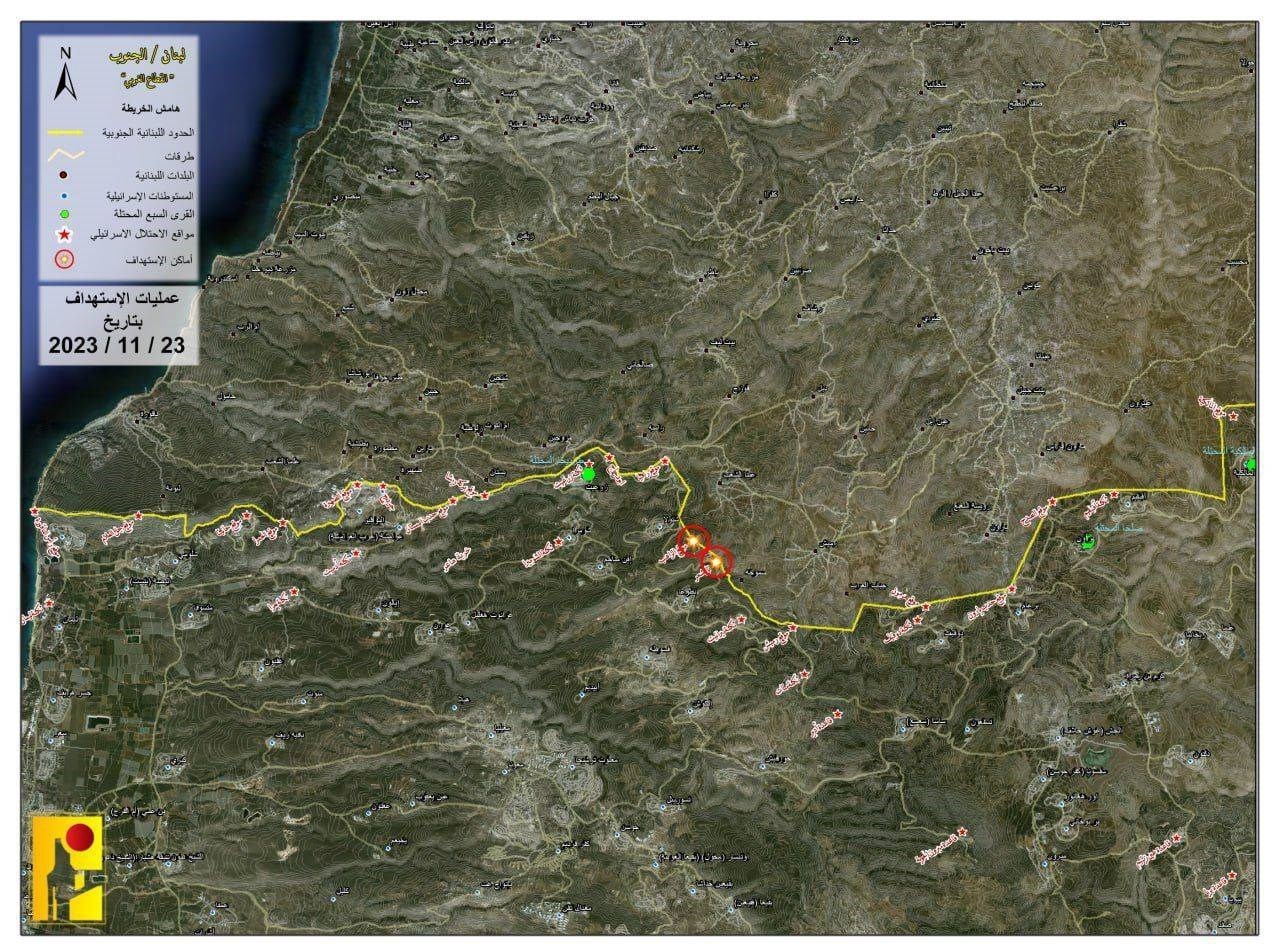 حزب‌الله در بیانیه اولی که صبح امروز منتشر شد اعلام کرد که در حمایت از ملت استوار فلسطین در نوار غزه و نیز در حمایت از مقاومت شجاع و شریف آن، رزمندگان مقاومت اسلامی لبنان ساعت 8:30 صبح امروز پنجشنبه 23 نوامبر محل تجمع پیاده‌نظام ارتش رژیم صهیونیستی در منطقه الضهیره را با سلاح‌های مناسب هدف قرار داده و تلفات مستقیمی به صفوف دشمن وارد کردند.
