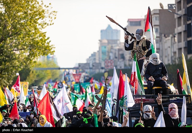 بر اساس این گزارش، جمعی از بسیجیان با لباسهای شبیه رزمندگان حماس و کاپشن و شلوار سه خط حضور یافته و تسلیحات فلسطینی از جمله ماکت راکتهای قسام را به نمایش گذاشتند.