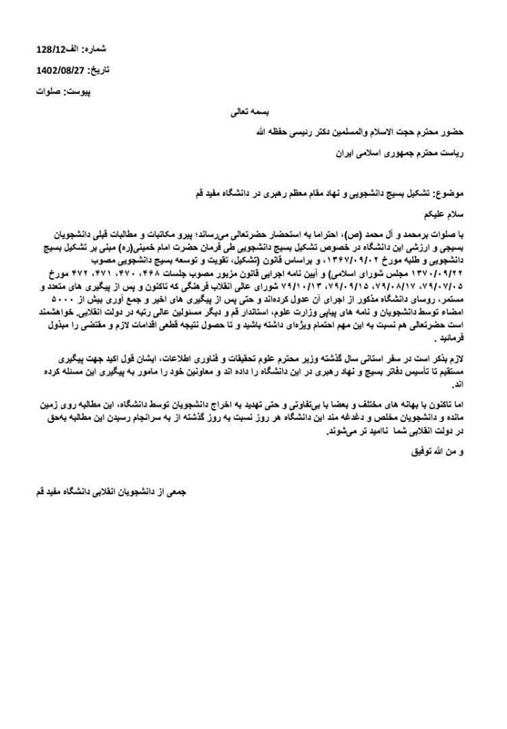بسیج دانشجویی دانشگاه‌های استان نامه‌ای با موضوع امتناع دانشگاه مفید مبنی بر ایجاد دفتر بسیج در دانشگاه را به اطلاع سیدمحمد آقامیری، استاندار قم رساندند.
