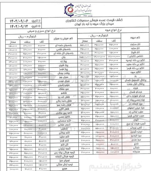 به گزارش خبرگزاری تسنیم، اسدالله کارگر با اعلام جزئیات قیمت انواع میوه و صیفی درجه یک تا درجه سه بر اساس نرخ‌نامه عمده‌فروشی محصولات کشاورزی در میدان میوه و تره‌بار تهران در دوره زمانی 6 تا 12 آذرماه سال 1402 گفت: بر اساس این نرخ‌نامه، قیمت هر کیلوگرم موز اکوادور بین 60 تا 72 هزار تومان، موز هندی بین 40 تا 60 هزار تومان و هر کارتن آناناس (6تایی) بین یک میلیون و 200 هزار تومان تا یک میلیون و 550 هزار تومان است.
