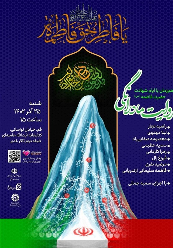 به گزارش خبرگزاری تسنیم، این نشست به مناسبت شهادت حضرت فاطمه(س) با حضور بانوان نویسنده، راضیه تجار، لیلا مهدوی، معصومه صفاییراد، سمیه عظیمی، زهرا کاردانی، فروغ زال، مرضیه نفری و فاطمه سلیمانی ازندریانی و اجرای سمیه جمالی در قم برگزار میشود.