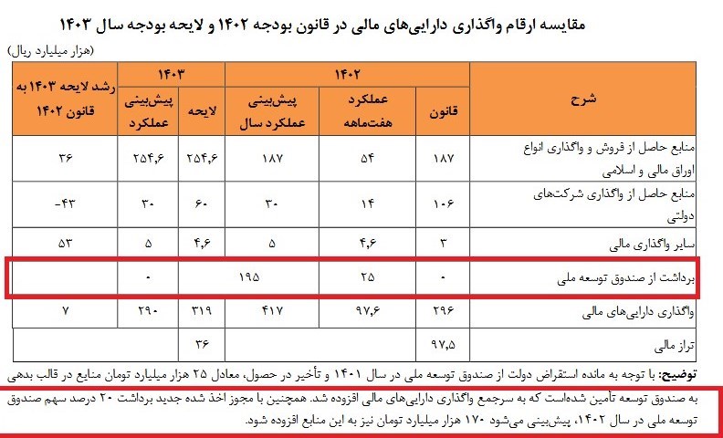 از سوی دیگر گزارش جدید صندوق توسعه ملی به ابعاد جدیدتری از برداشت دولت از صندوق توسعه ملی در سال جاری اشاره کرده است؛ در این گزارش با اشاره به عدم تسویه 25 هزار میلیارد تومان از منابع استقراض شده از صندوق توسعه ملی در سال 1401 امده است، با مجوز اخذ شده جدید برداشت 20 درصد سهم صندوق توسعه ملی در سال 1402 پیش بینی می شود 170 هزار میلیارد تومان نیز به این منابع افزوده شود.