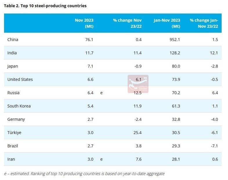 همچنین طی 11 ماهه نخست سال جاری میلادی، چین با تولید 952 میلیون و 100 هزار تن فولاد خام همچنان صدرنشین تولید این محصول در جهان است. پس از آن، هند با تولید 128 میلیون و 200هزار تن، ژاپن با تولید 80 میلیون تن و ایالات متحده آمریکا با تولید 73 میلیون و 900 هزار تن و روسیه با تولید70 میلیون و 200 هزار تن فولاد خام توانستند به ترتیب در رتبه های دوم تا پنجم بایستند.