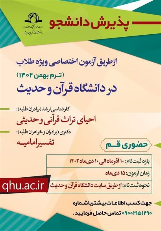ثبت نام در این رشته ها از طریق آزمون اختصاصی ویژه طلاب و مهلت ثبت نام تا دهم دی خواهد بود. علاقهمندان میتوانند از طریق سامانه پذیرش دانشجو در مقاطع کارشناسی ارشد و دکتری ویژه طلاب برای نیمسال دوم 1403-1402 و از طریق این پیوند ثبت نام خود را انجام دهند و یا با تلفن راهنمای ثبت نام به شماره 09002151290 تماس بگیرند.