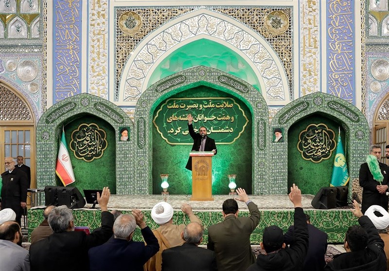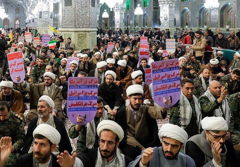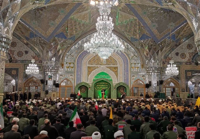 زائران و مجاوران بارگاه منور امام هشتم علیه السلام در این مراسم شعارهای حمایت از مردم مظلوم فلسطین، نظام مقدس جمهوری اسلامی و رهبر معظم انقلاب اسلامی سر دادند.