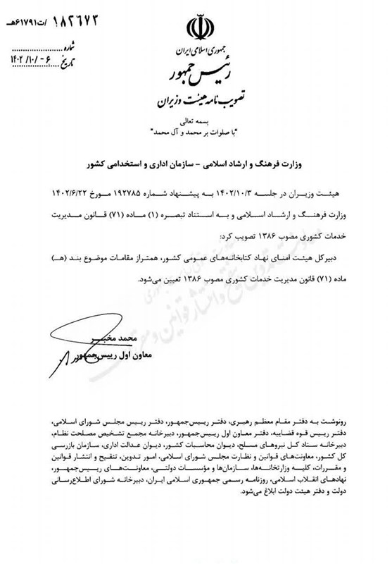 در این راستا تصویبنامه مصوب جلسه مورخ 1402/10/03 هیات وزیران درخصوص «همتراز شدن دبیرکل هیات امنای نهاد کتابخانه های عمومی کشور با مقامات موضوع بند ه ماده 71 قانون مدیریت خدمات کشوری» طی نامه شماره 182673 در تاریخ 1402/10/06 توسط معاون اول رییس جمهور ابلاغ شد.