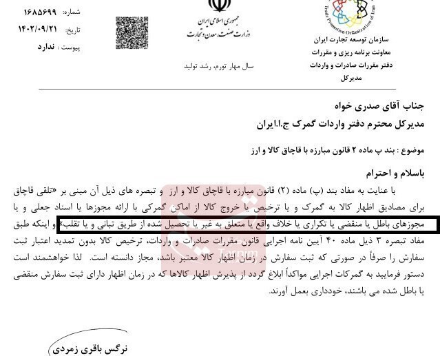 لازم به ذکر است، مدیر کل دفتر مقررات صادرات  واردات در مکاتبه ای با دفتر واردات گمرک ایران، نوشت با عنایت به مفاد بند (پ) ماده ( ٢) قانون مبارزه با قاچاق کالا و ارز و تبصره های ذیل آن مبنی بر" تلقی قاچاق برای مصادیق اظهار کالا به گمرک و یا ترخیص یا خروج کالا از اماکن گمرکی با ارائه مجوزها یا اسناد جعلی و یا مجوزهای باطل یا منقضی یا تکراری یا خلاف واقع یا متعلق به غیر یا تحصیل شده از طریق تبانی و یا تقلب "و اینکه طبق مفاد تبصره ٣ ذیل ماده 40 آیین نامه اجرایی قانون مقررات صادرات و واردات، ترخیص کالا بدون تمدید اعتبار ثبت سفارش را صرفاً در صورتی که ثبت سفارش در زمان اظهار کالا معتبر باشد، مجاز دانسته است.