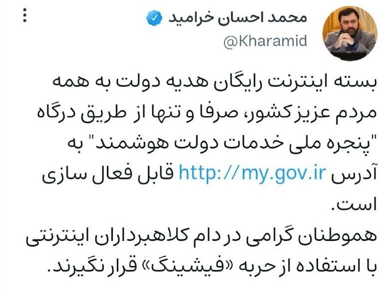 به گزارش خبرگزاری تسنیم، رییس مرکز روابط‌عمومی و اطلاع‌رسانی وزارت ارتباطات در فضای مجازی نوشت: بسته اینترنت رایگان هدیه دولت به همه مردم عزیز کشور، صرفاً و تنها از طریق درگاه "پنجره ملی خدمات دولت هوشمند" به آدرس http://my.gov.ir قابل فعال‌سازی است.