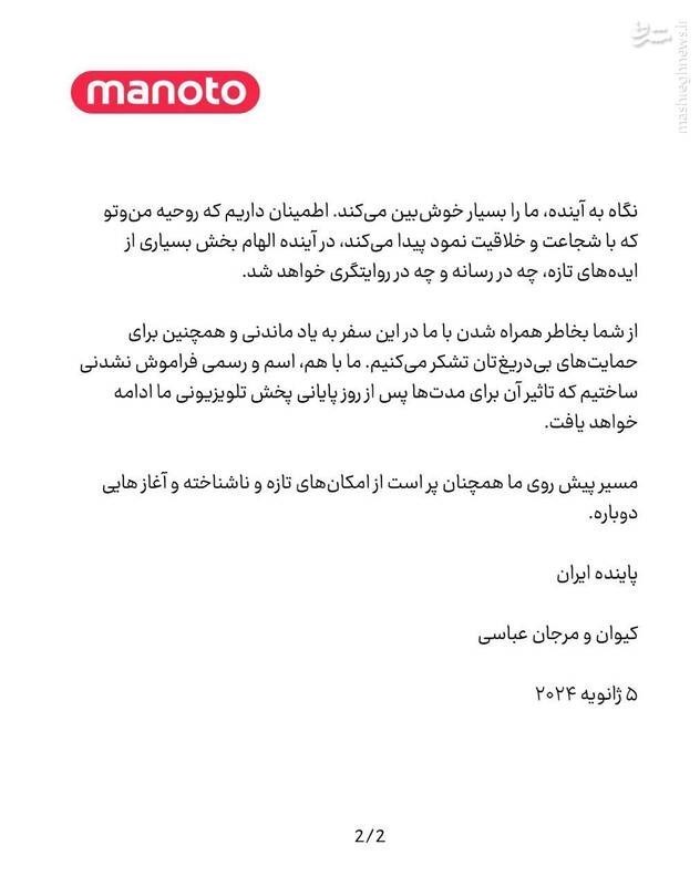 به گزارش گروه رسانههای خبرگزاری تسنیم، باران - کیوان و مرجان عباسی، مدیران شبکه منوتو، با صدور یک بیانیه در صفحات مجازی این شبکه، آخرین پخش تلوزیون منوتو را مورخ 31 ژانویه 2024 مصادف با 11 بهمن 1402 اعلام کردند.